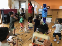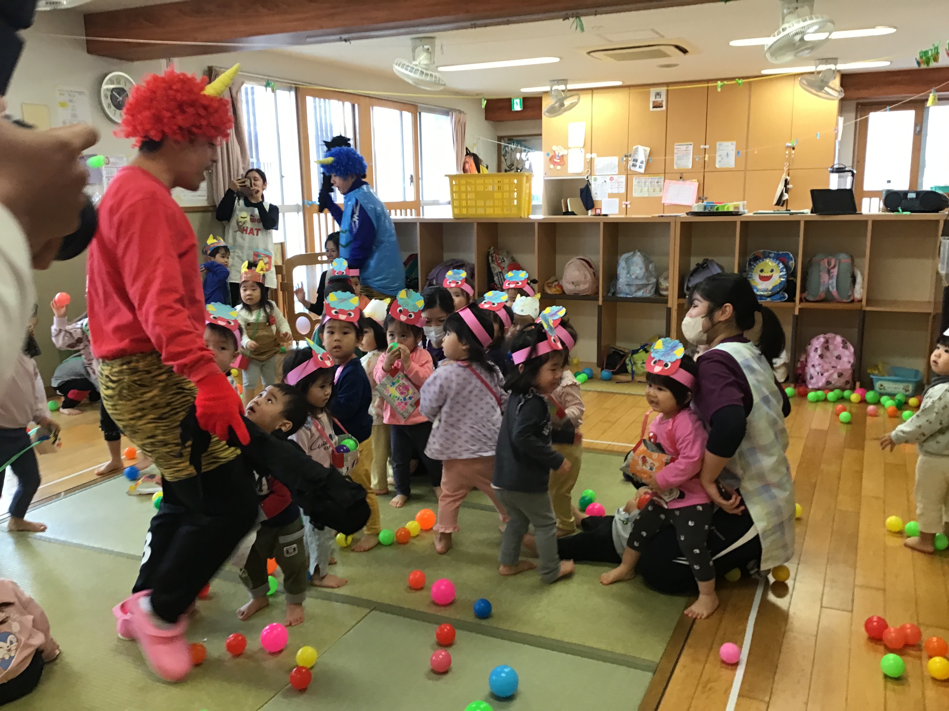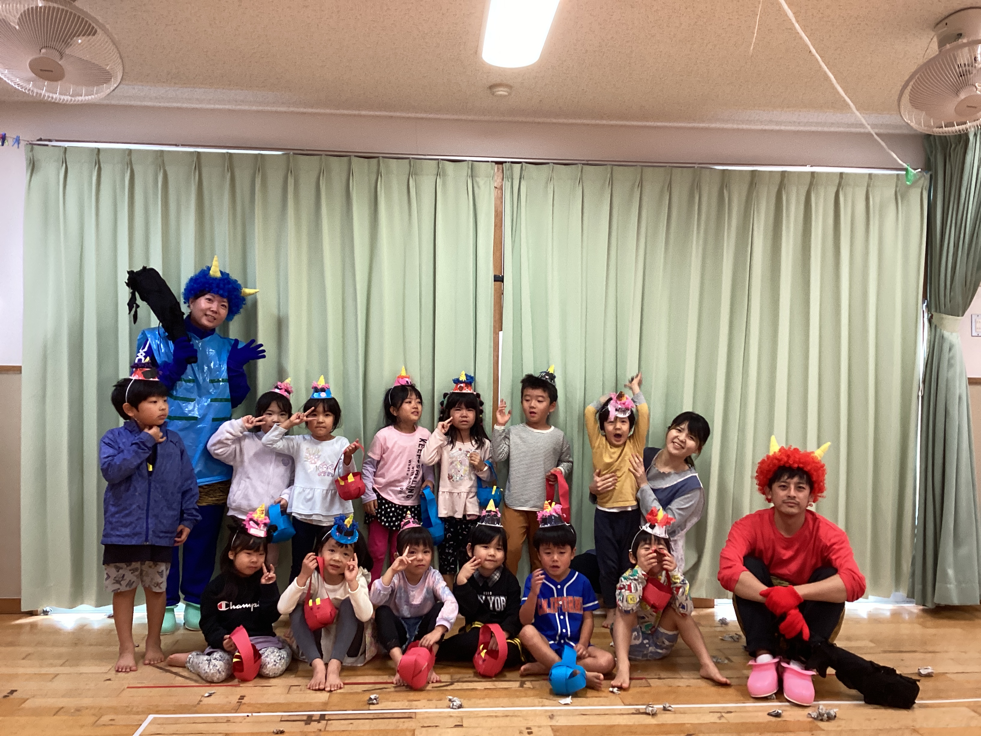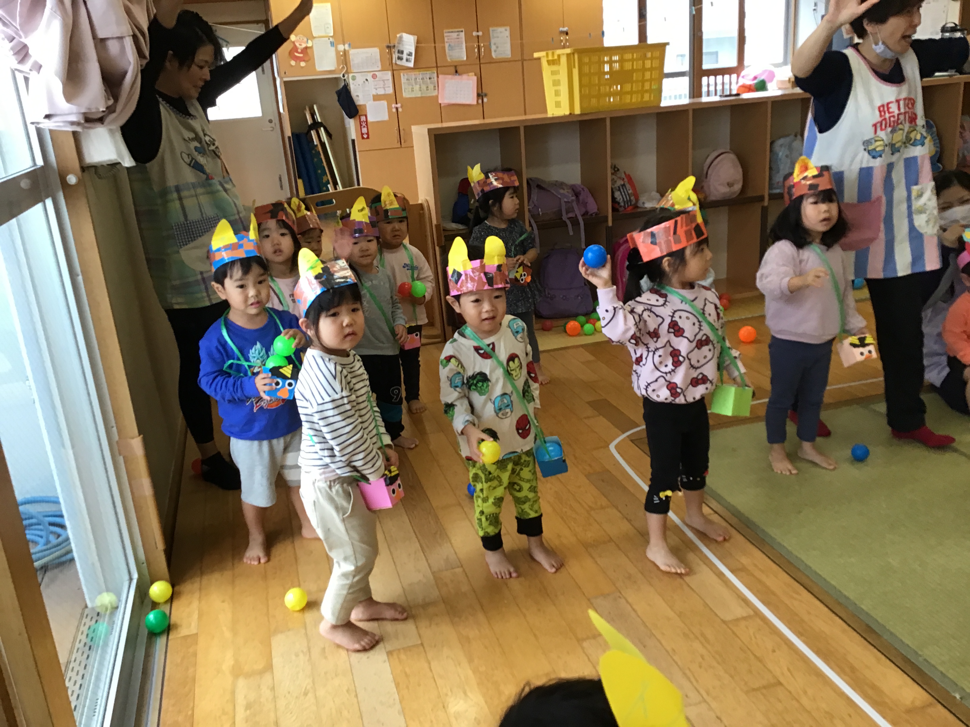 各クラスで作った豆入れやお面をかぶって、豆まきを行い